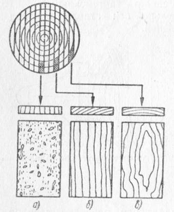 строганой фанеры: а - тангентальный, б - радиальный, в - полурадиальный,