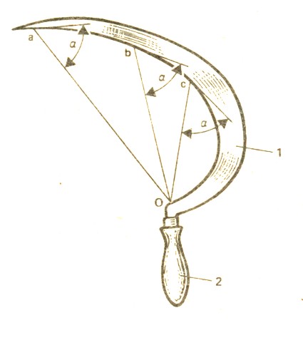 Серп Серп предназначается для уборки (жатвы) зерновых культур. В наше время он используется на небольших опытных делянках, а также для уборки полеглых хлебов и риса. Серп состоит из изогнутого ножа с рукояткой (рис. 24). Форма режущей части ножа, а значит, и серпа определяется необходимостью обеспечения одинакового усилия в любой точке лезвия, возникающего при резании. В свою очередь, постоянство усилий в любой точке режущей кромки обеспечивается постоянством угла а в любой точке лезвия ножа (угол а - угол между прямой, проведенной из точки О, расположенной на оси симметрии рукоятки, в какую-либо точку лезвия ножа, и касательной в этой точке к кривой лезвия). Многолетняя практика использования серпов показала, что угол а=51° является оптимальным. На режущей кромке полотна (рис. 25) делается насечка глубиной 0,4 мм, в результате чего лезвие ножа состоит как бы иЭ зубцов. Насечка выполняется или перпендикулярно к кромке лезвия (тип 1), или же под острым углом к ней (тип 2). Наибольшее распространение получили серпы с насечкой типа 2.